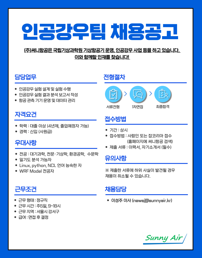 (주)써니항공 인공강우팀 신입사원 채용 공고 링크 (사람인)
