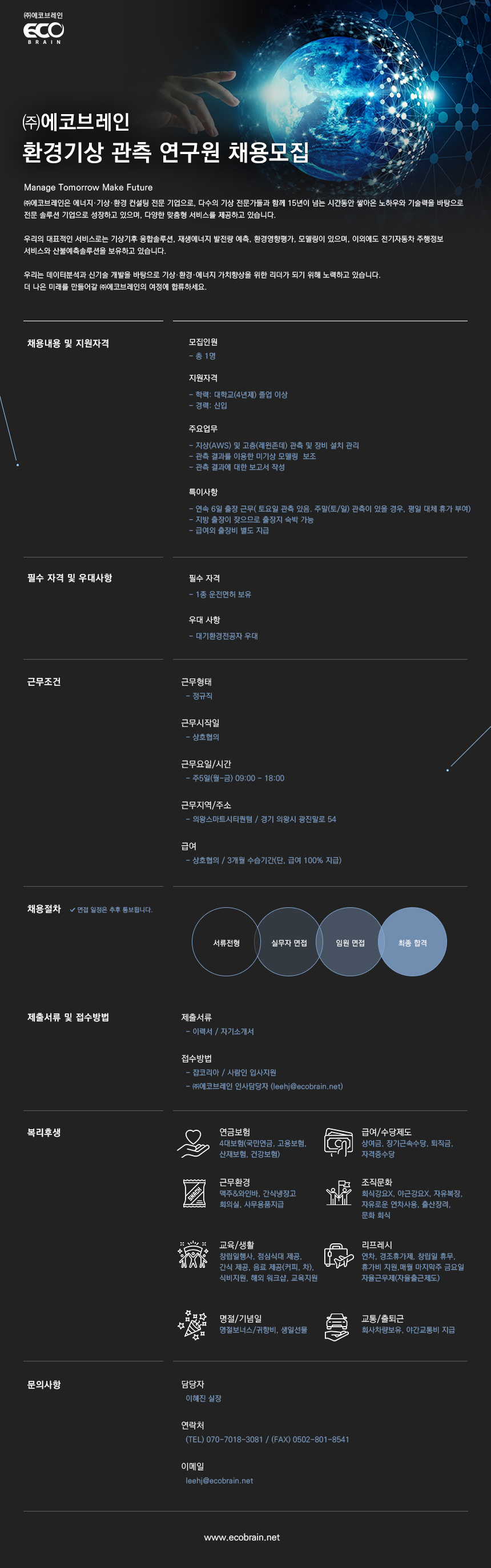 (주)에코브레인 환경기상 관측 연구원 채용 공고