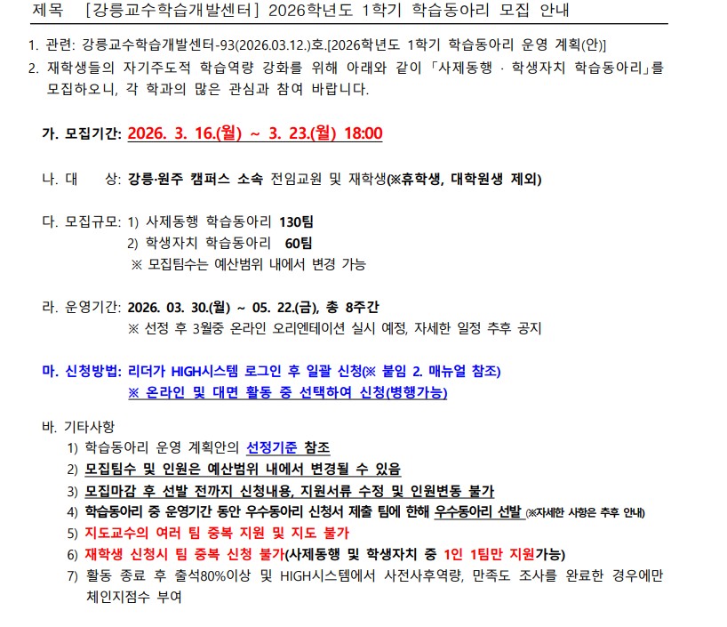 [강릉교수학습개발센터] 2026학년도 1학기 학습동아리 모집 안내