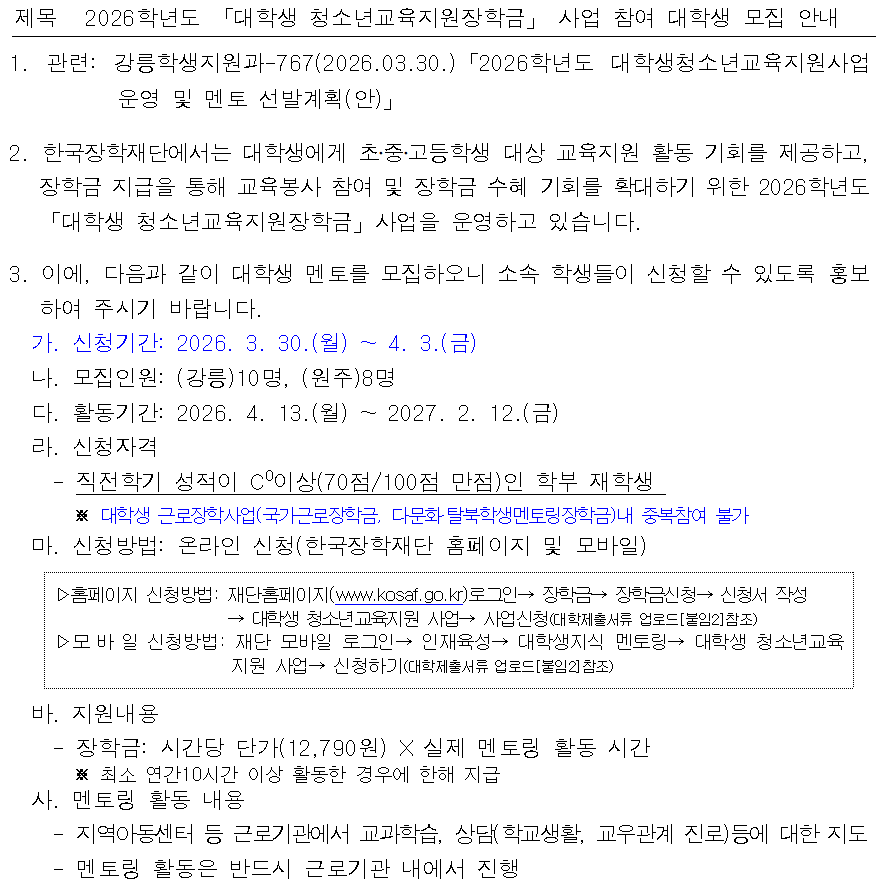 2026학년도 「대학생 청소년교육지원장학금」 사업 참여 대학생 모집 안내