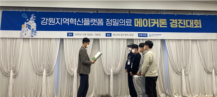 우리 대학(총장 반선섭) 산업경영공학과 명재홍(3학년), 조용민(3학년), 정제훈(2학년), 최호준(2학년) 학생이 지난 2022년 12월 2일, 12월 3일 이틀 동안 춘천시 소재 베니키아 춘천베어스호텔에서 진행된 ‘강원지역혁신플랫폼 정밀의료 메이커톤’에서 『사업단장상』을 수상했다.