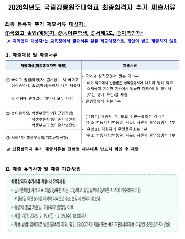 2026학년도 정시모집 최종합격자 추가 제출서류 안내