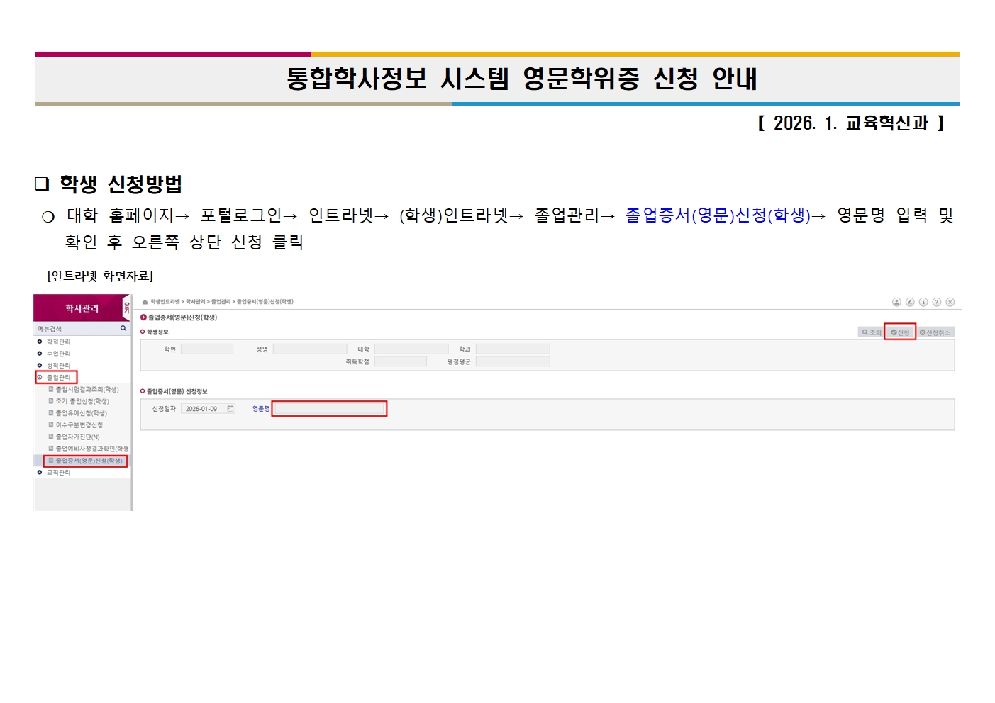 3. 신청방법 : (학생)인트라넷-졸업관리-졸업증서(영문)신청(학생)-영문명 입력 및 확인 후 오른쪽 상단 신청 클릭