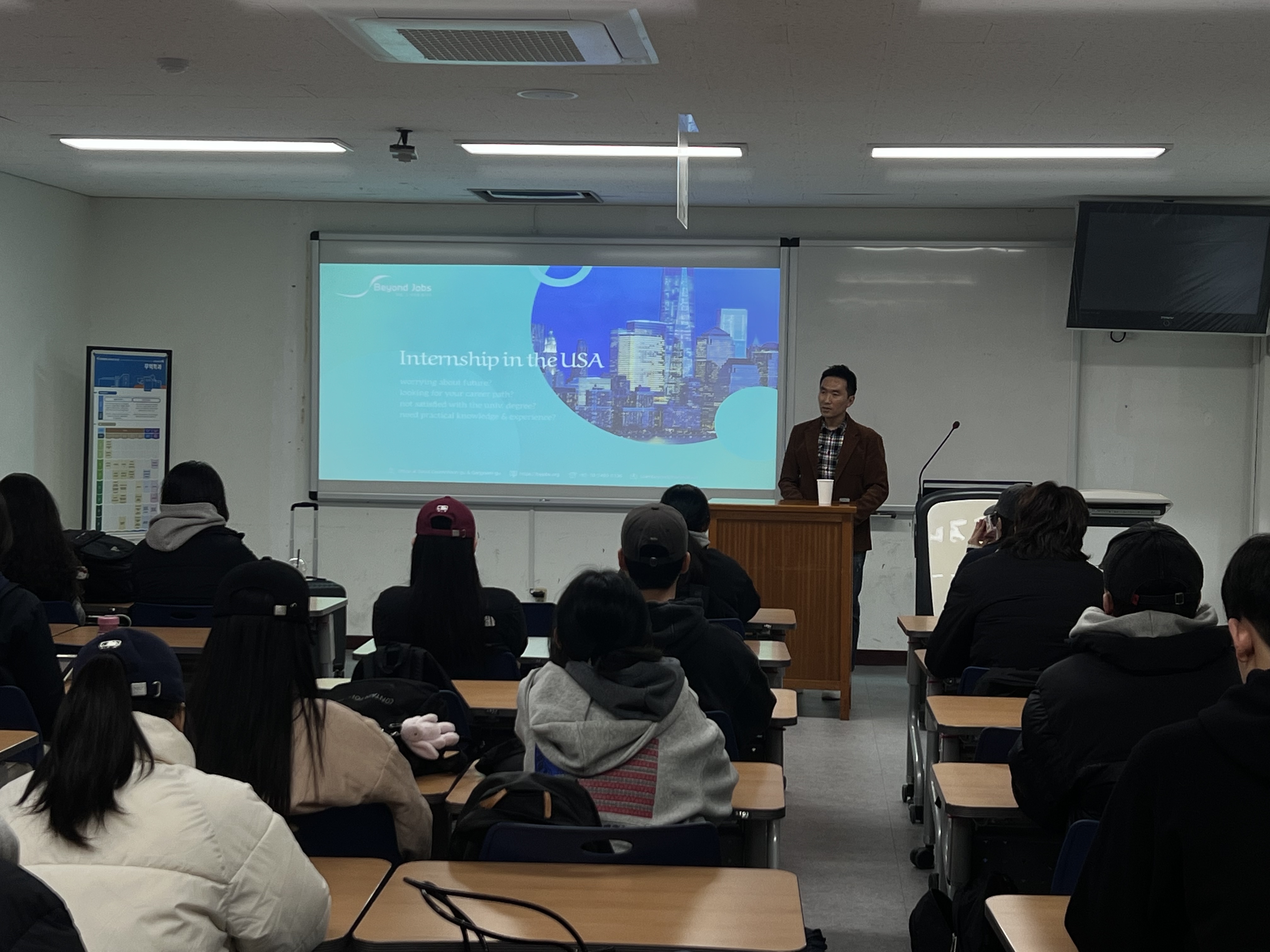 무역학과가 미국 무역·물류기업 인턴십 운영 기관인 Team Beyond와의 업무협약(MOU)을 기반으로 운영하고 있는 해외 인턴십 프로그램 설명회에는 Team Beyond 전병진 대표가 직접 참여하여 미국 무역·물류기업 인턴십 프로그램의 운영 방식과 참가 절차, 선발 과정, 근무 환경, 비자 준비 과정 등 해외 인턴십 참여에 필요한 주요 사항을 설명하였다.