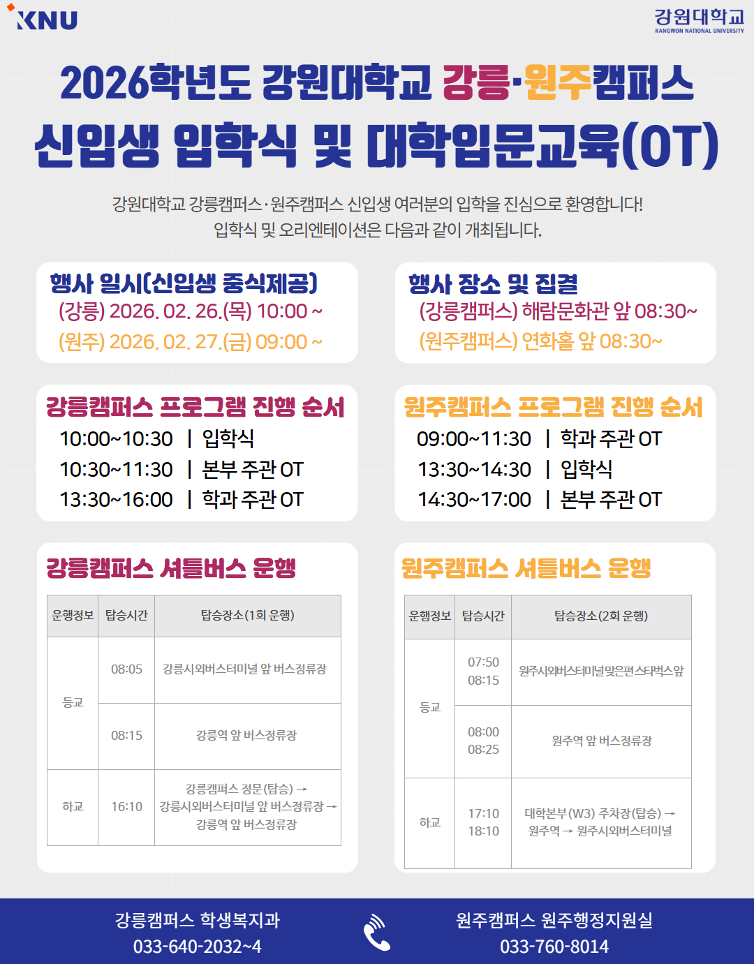 fnctId=bbs,fnctNo=1606 2026학년도 강원대학교 강릉·원주캠퍼스 신입생 입학식 및 대학입문교육(OT) 안내 분류 기타 작성일 2026.02.10 작성자 문준명 조회수 3039 첨부파일 2026학년도 입학식 및 대학입문교육(OT) 안내.pdf