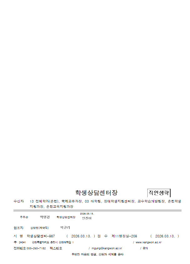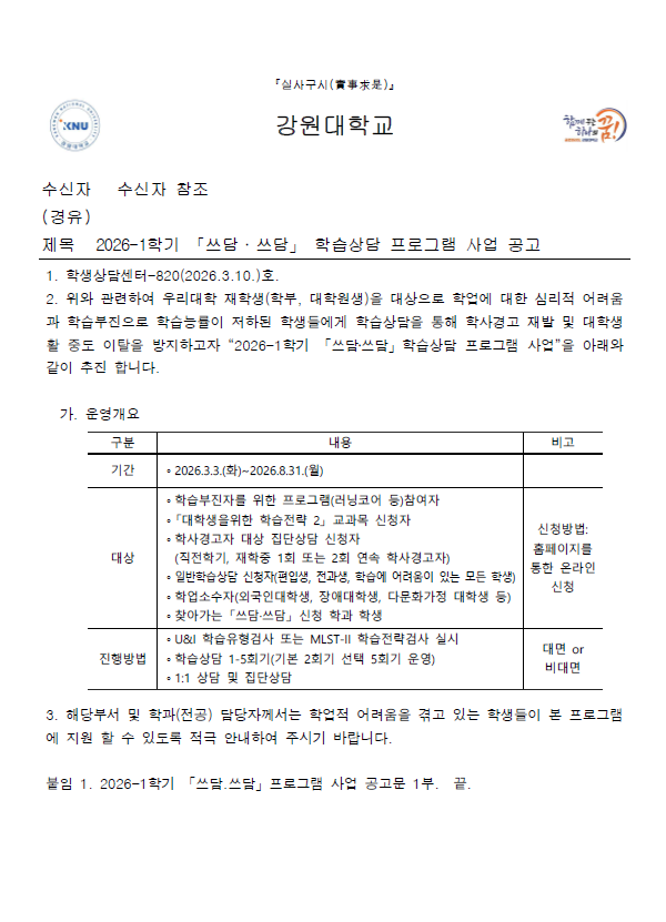 fnctId=bbs,fnctNo=840 2026-1학기 「쓰담·쓰담」 학습상담 프로그램 안내 작성일 2026.03.17 작성자 원민정 조회수 281 2026-1학기 「쓰담·쓰담」 학습상담 프로그램 안내 기간 : 2026.3.3.(화)~2026.8.31.(월) 첨부파일 1.[공고문] 2026-1학기 '쓰담.쓰담' 프로그램 사업공고.pdf 2026-1학기 「쓰담·쓰담」 학습상담 프로그램 사업 공고.pdf