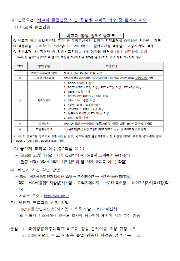 fnctId=bbs,fnctNo=840 2026학년도 비교과 활동 졸업인증제 안내드립니다. 작성일 2026.03.31 작성자 원민정 조회수 36 2026학년도 비교과 활동 졸업인증제 시행 알림 첨부파일 2026학년도 비교과 활동 졸업 인증제 자격증 영역.pdf 2026학년도 비교과 활동 졸업인증제 시행 알림.pdf 국립강릉원주대학교 비교과 활동 졸업인증 운영 규정.pdf