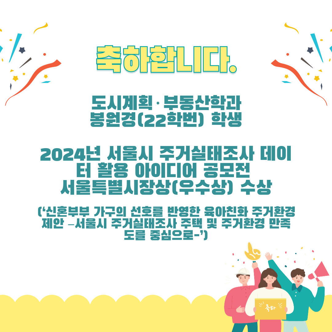 2024 서울시 주거실태조사 데이터 활용 아이디어 공모전 서울특별시장상(우수상) 수상도시계획 부동산학과 학부생 봉원경 학생2024 서울시 주거실태조사 데이터 활용 아이디어 공모전 서울특별시장상(우수상) 수상 우리대학 도시계획 부동산학과 학부생인 봉원경(22학번)2024.10.07