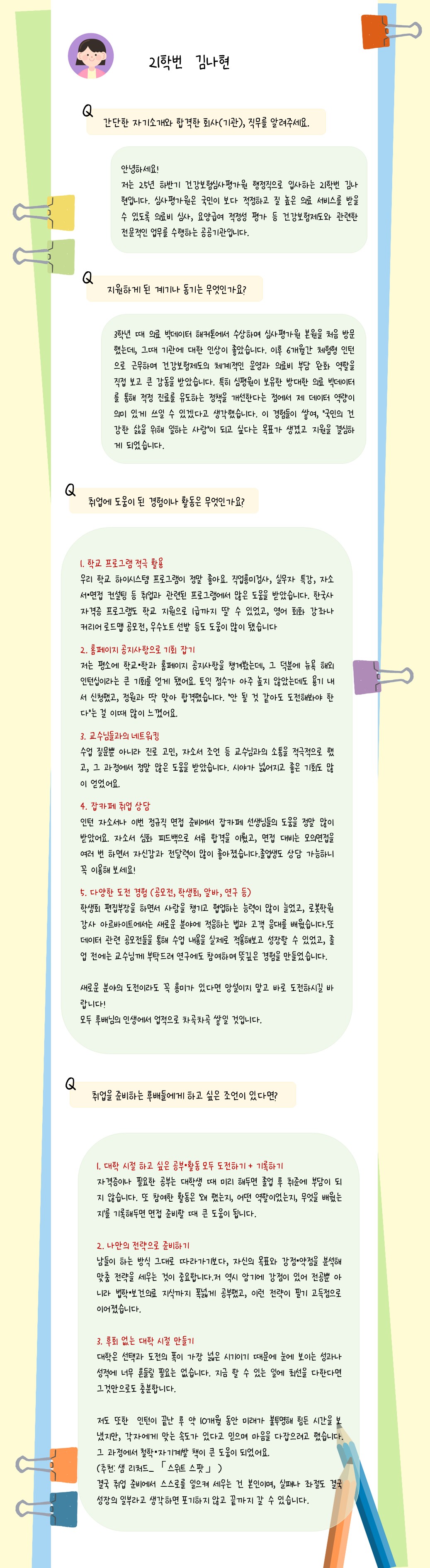 fnctId=bbs,fnctNo=242 [선배들의 취업 스토리] 21학번 김나현 졸업생 (건강보험심사평가원) 작성일 2025.12.11 작성자 데이터사이언스학과 조회수 1025 “취업 고민하는 후배들을 위한 선배들의 진짜 조언” “취업 준비? 선배들의 경험담에서 답을 찾아보세요 :)” 첨부파일 첨부파일이(가) 없습니다.
