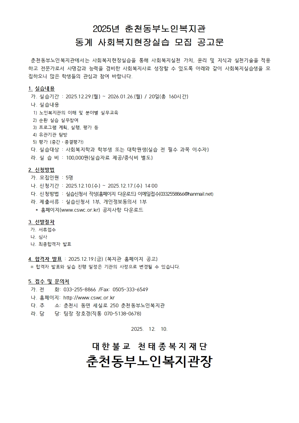 fnctId=bbs,fnctNo=849 [2026-동계] 춘천동부노인복지관 동계 실습생 모집 안내(~12.17.) 작성일 2025.12.15 작성자 박아름 조회수 930 첨부파일 붙임1) 공고문.hwp 붙임2) 신청서.hwp